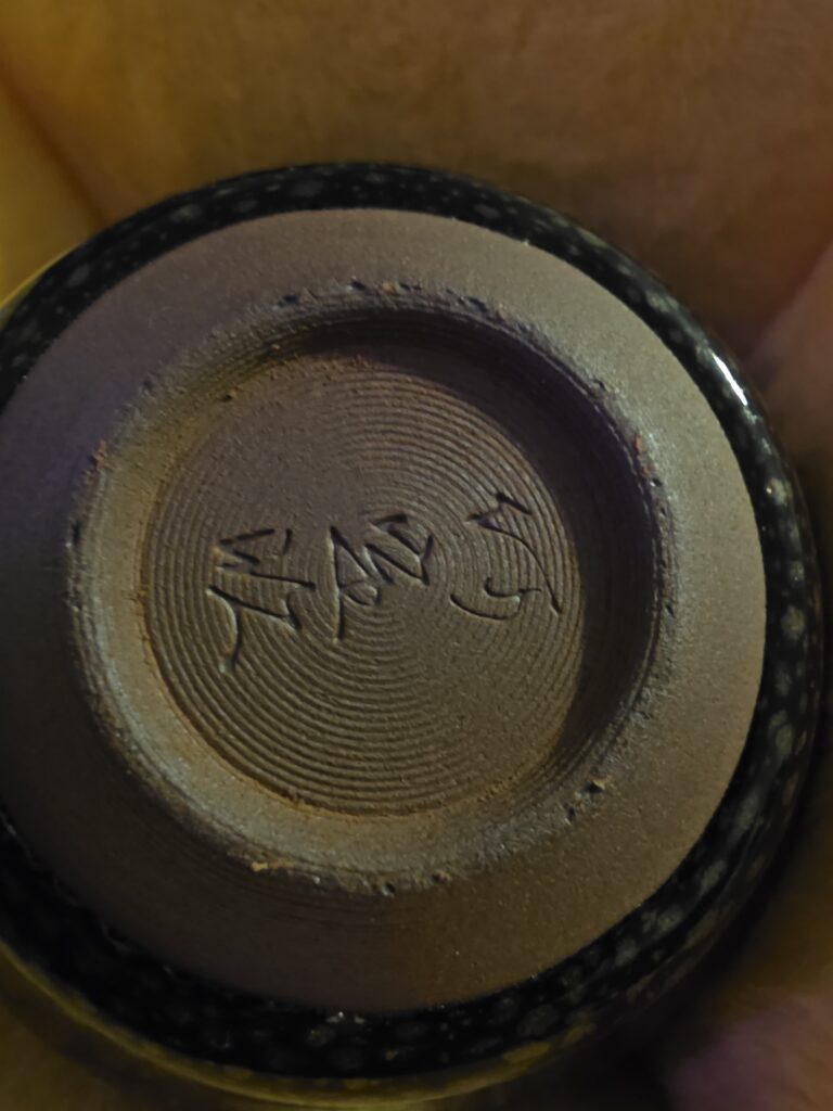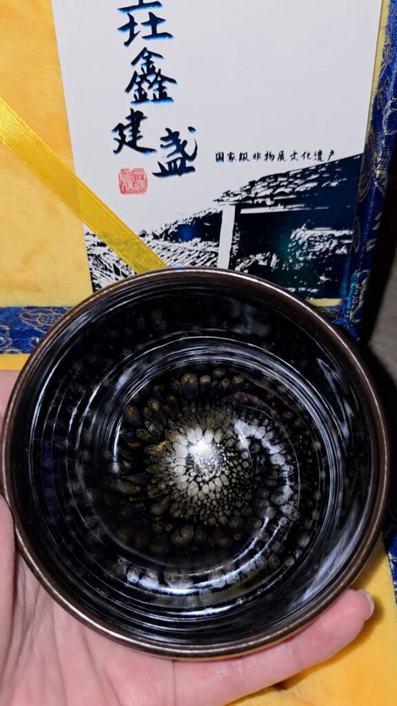 This handcrafted Jianzhan teacup features the distinctive partridge feather glaze — a traditional and highly prized pattern in Song dynasty-style tea ceramics. The glaze forms layered, feather-like streaks with a luminous, sparkling finish that catches the light beautifully. The cup is signed by master ceramicist He Dingxin (何定欣), whose work is known for balancing classical forms with refined contemporary artistry.
