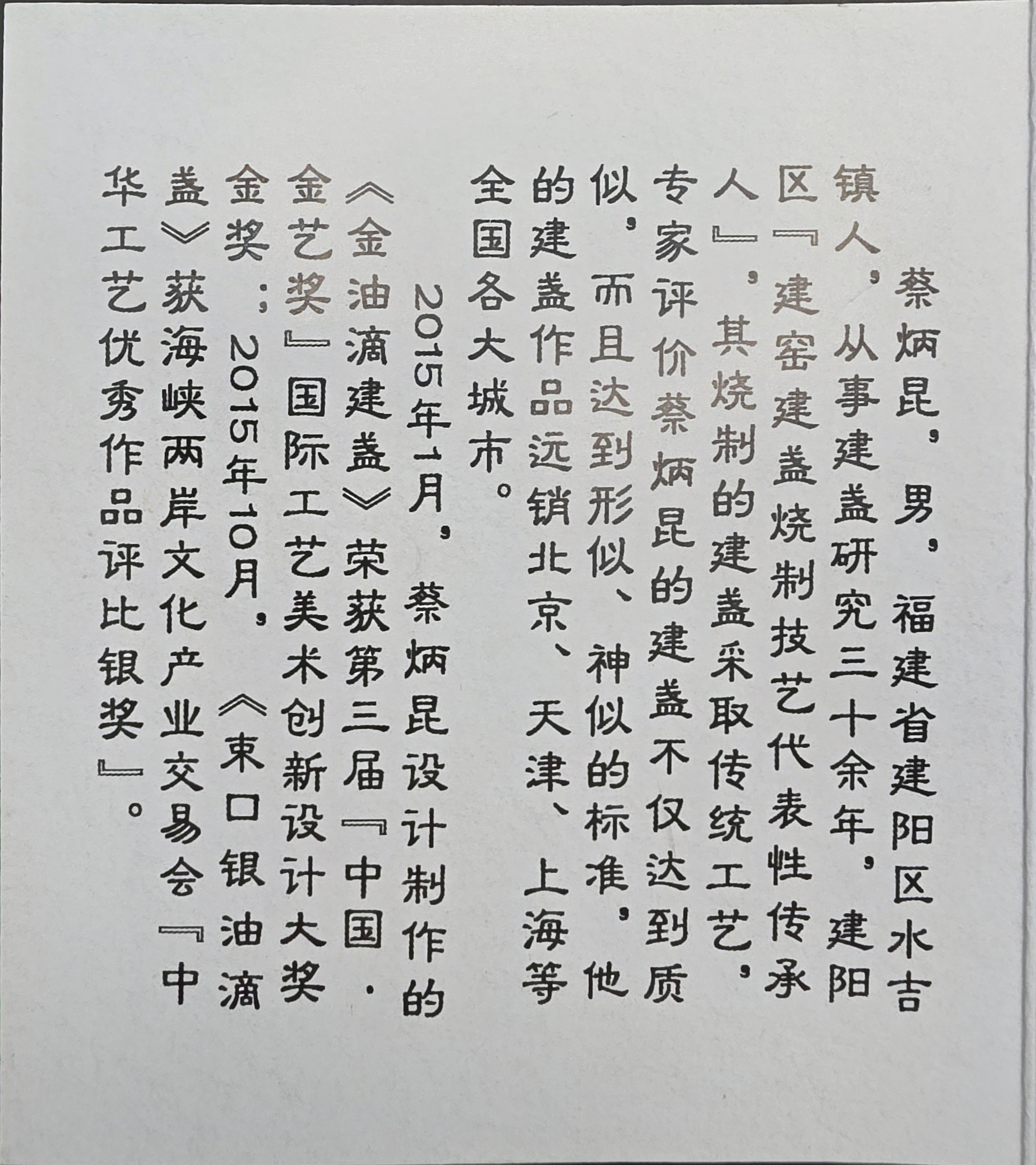 Cai Yukun is a recognized master of traditional Jian Zhan (建盏) pottery from Shuiji Town, Jianyang District, Fujian Province. With over 30 years of experience, he has dedicated his career to researching and perfecting the art of Jian ware firing techniques.