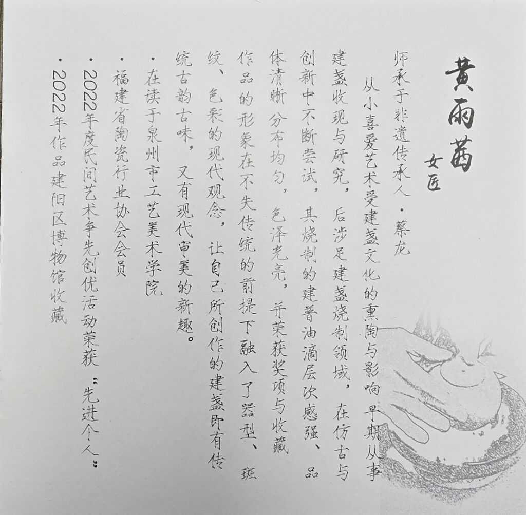 A graduate of Quanzhou Normal University’s Department of Art, Huang is a member of the Arts & Crafts Committee of the Fujian Ceramic Industry Association. In 2022, she was named an Outstanding Individual of the Year in Jianyang District, and her works have been acquired by the Jianyang District Museum—marking her as a noteworthy emerging force in contemporary Jian Zhan.