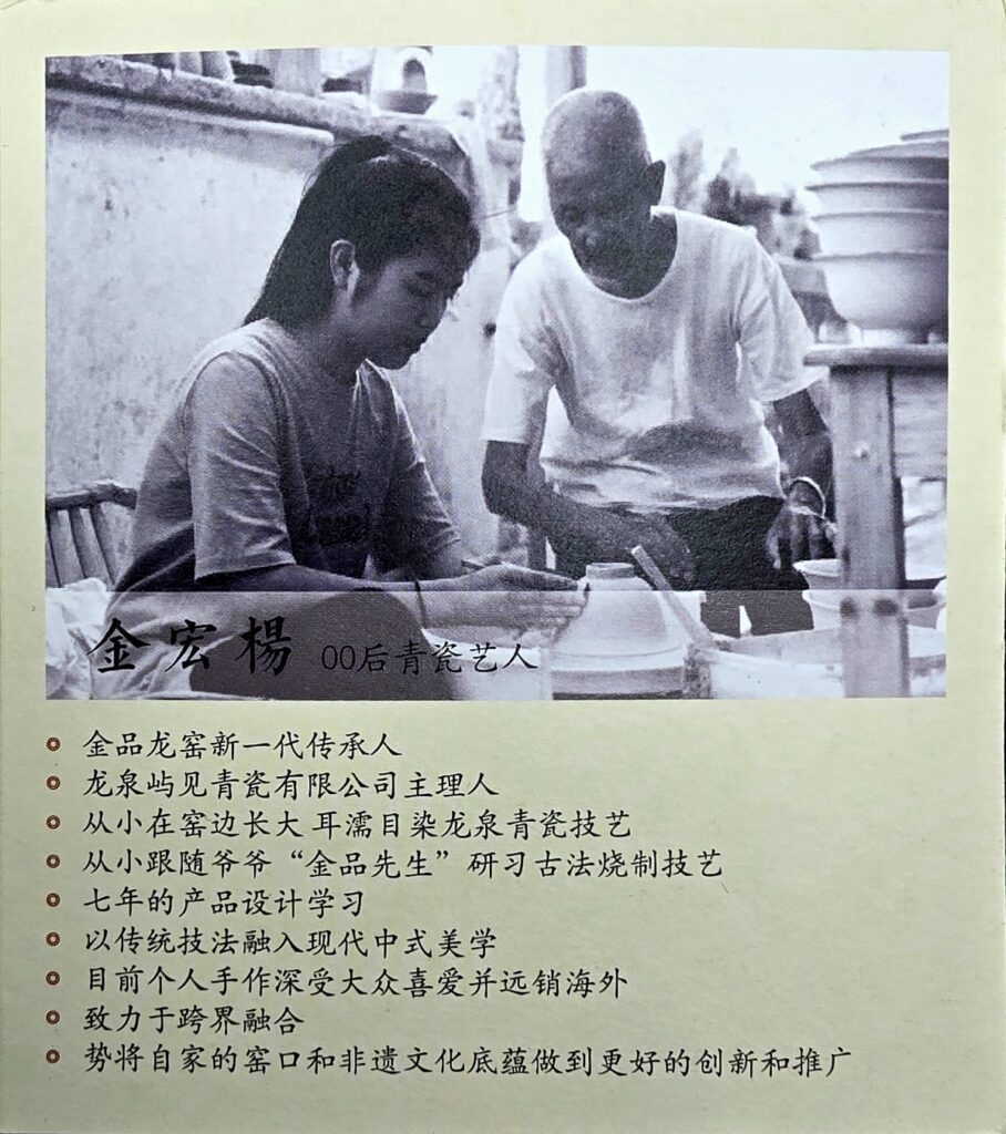 Jin Hongyang is a new-generation Longquan celadon artist and inheritor of the Jin Pin Kiln tradition. Born in the 2000s, she grew up in the historic kiln town of Baoping, surrounded by the rich cultural heritage of Longquan celadon. Today, she is the manager of Longquan Mingyuan Ceramics Co., Ltd. and a key figure in continuing her family’s ceramic legacy.