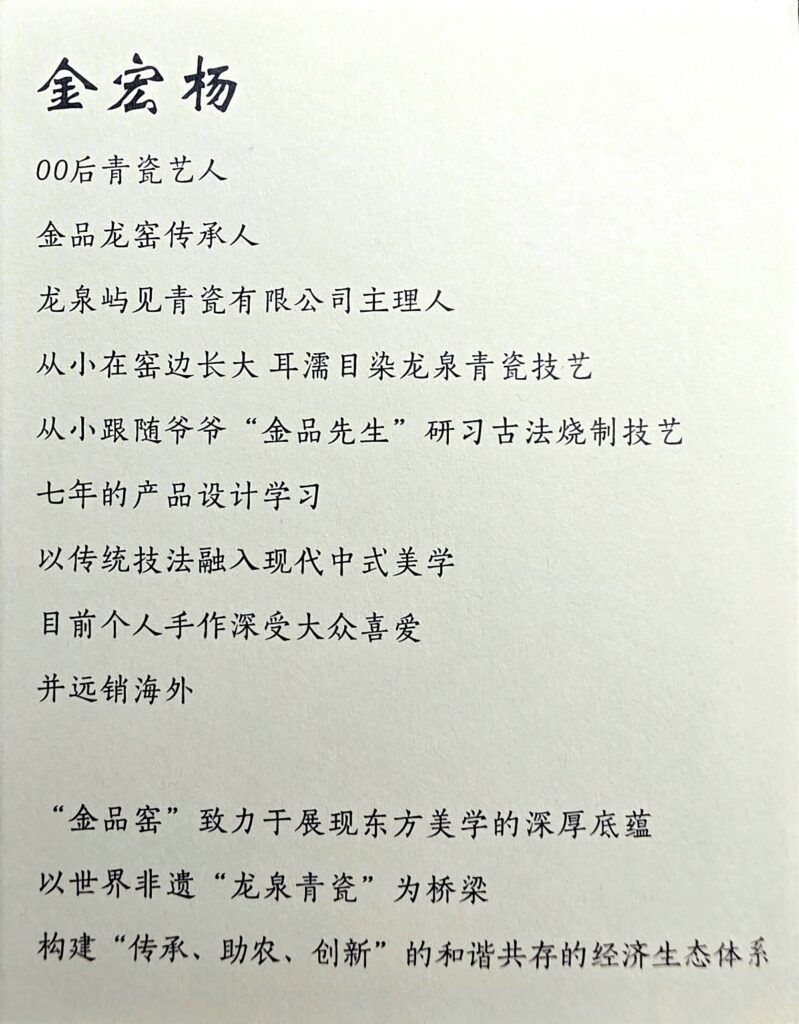 As the face of the Jin Pin Kiln’s new era, Jin Hongyang is committed to showcasing the depth of Oriental aesthetics through the world-famous Longquan celadon. She aims to preserve, assist rural development, and innovate, ensuring that this centuries-old craft continues to thrive for future generations. Her work not only honors her family’s heritage but also brings Longquan celadon to new audiences worldwide.