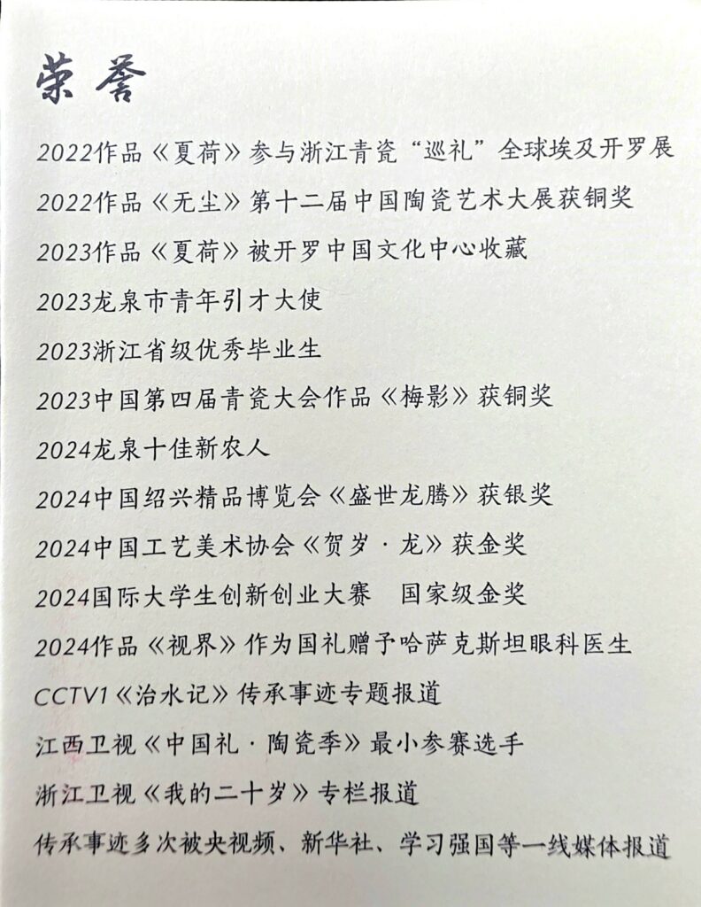 • 2023 – Named Longquan City Youth Talent Ambassador and Zhejiang Province Outstanding Graduate.