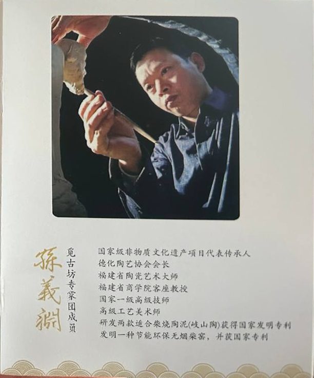 Sun Yiyuan (born 孙哎谢) is a nationally recognized inheritor of intangible cultural heritage and a core member of the Kuangufang studio. He serves as president of the Dehua Ceramics Association and holds the title of senior arts and crafts master in Fujian Province. He is also a professor at Fujian Business College.
