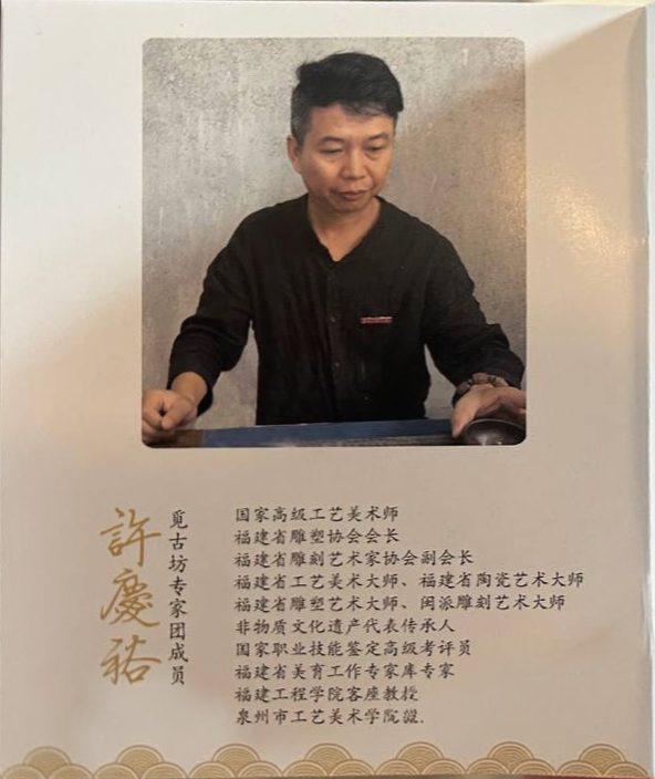 Xu has been awarded the titles of master artisan in multiple disciplines, including ceramic sculpture and glaze painting. He is a recognized inheritor of intangible cultural heritage and has been honored with national-level teaching awards. Xu also serves as a senior expert for vocational skill training, a guest professor at several institutions, and a faculty member at Quanzhou University of Arts and Crafts.