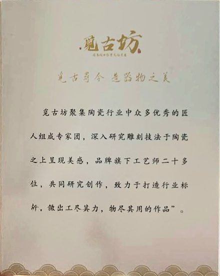 Kuangufang brings together outstanding ceramic artists and craftsmen to research and develop unique carving techniques, expressing the beauty of ceramics through craftsmanship. The studio employs over twenty artisans, working collaboratively to create high-quality works with both artistic and practical value.