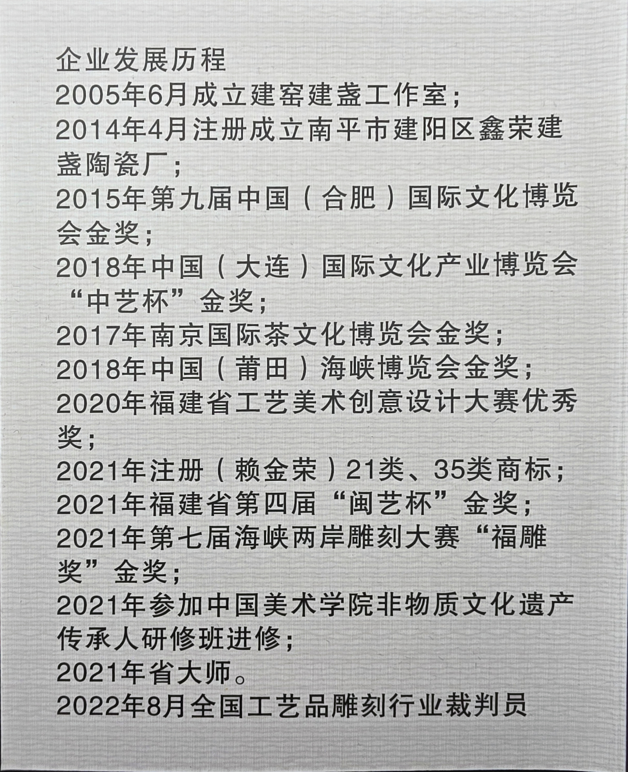 • 2017–2018: Multiple gold awards at national/international ceramic and tea culture exhibitions