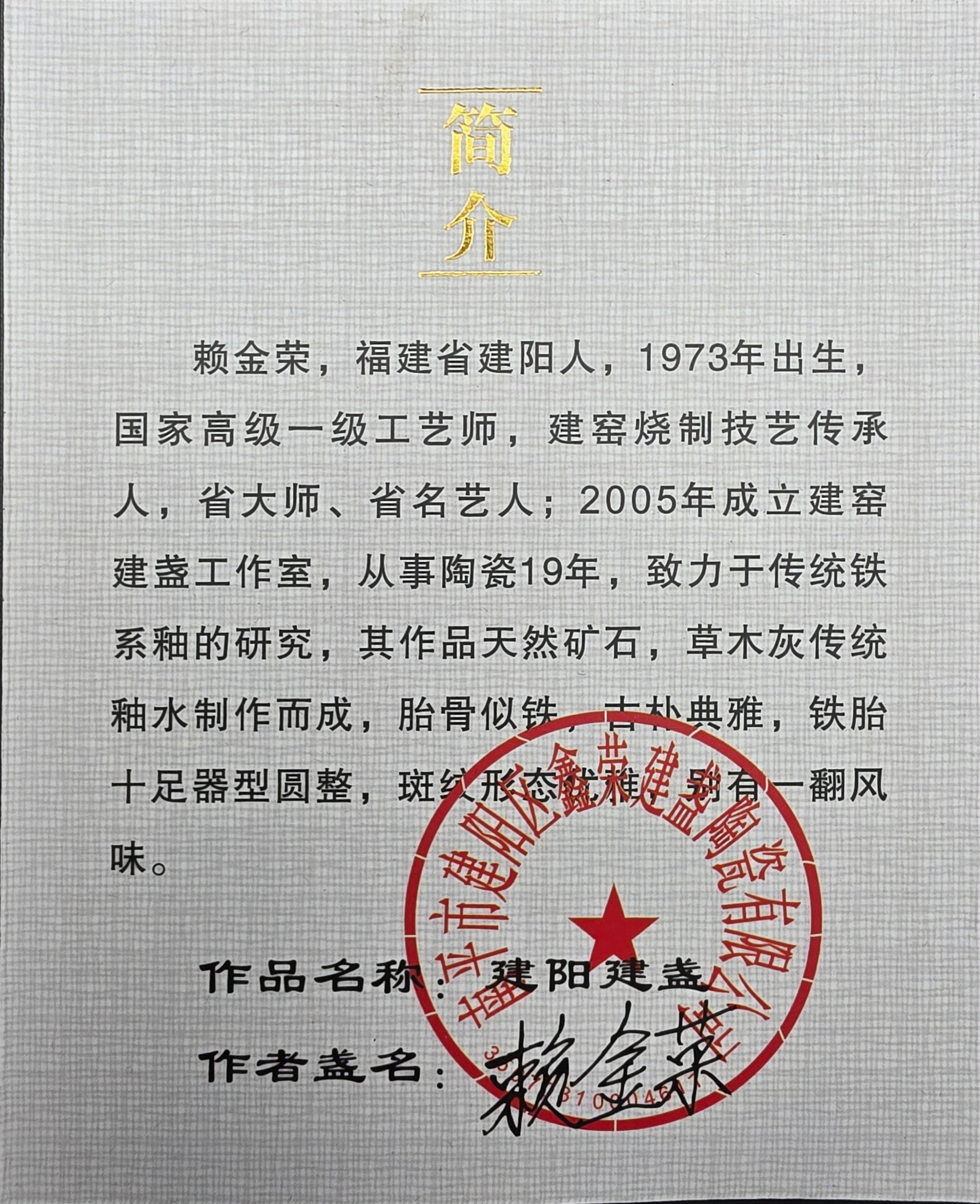 Titles: National Senior Ceramic Arts and Crafts Master · First-Class Ceramicist · Recognized Inheritor of Jian Ware Craftsmanship