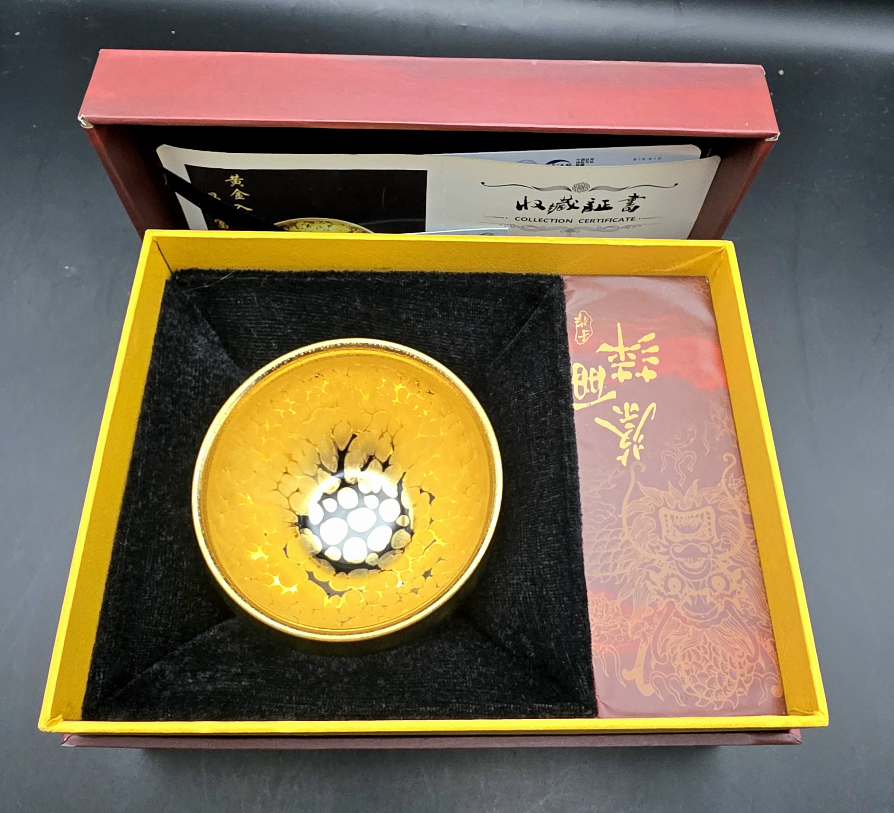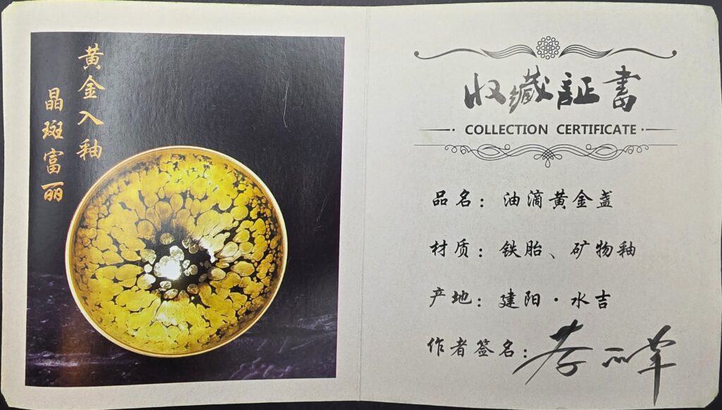This specific creation showcases Lao Chuan’s Golden Oil-Spot (油滴黄金盖) glaze, with confirmed gold content embedded in the glaze pattern itself. The rich golden hue symbolizes prosperity and good fortune in Chinese tea culture. Made in Shuiji, Jianyang, it reflects both historical reverence and modern refinement.