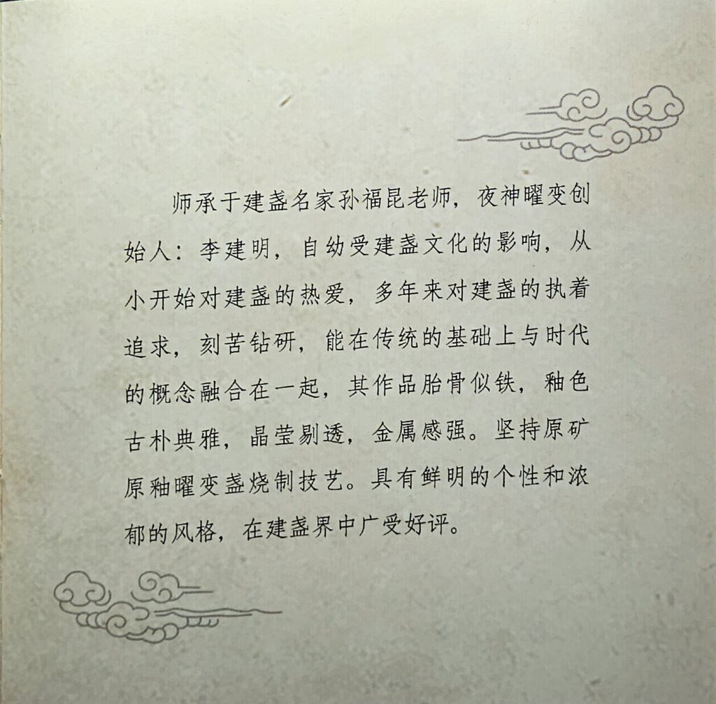 Li Jianming (李建明) is a Jianzhan artist associated with the studio or creative line Yaobian (曜变), a name that refers to the dramatic “flare-transformation” glaze effects admired in Jian ware. According to the booklet accompanying his work, Li Jianming was influenced by Jianzhan culture from a young age and developed a deep dedication to the craft over many years.