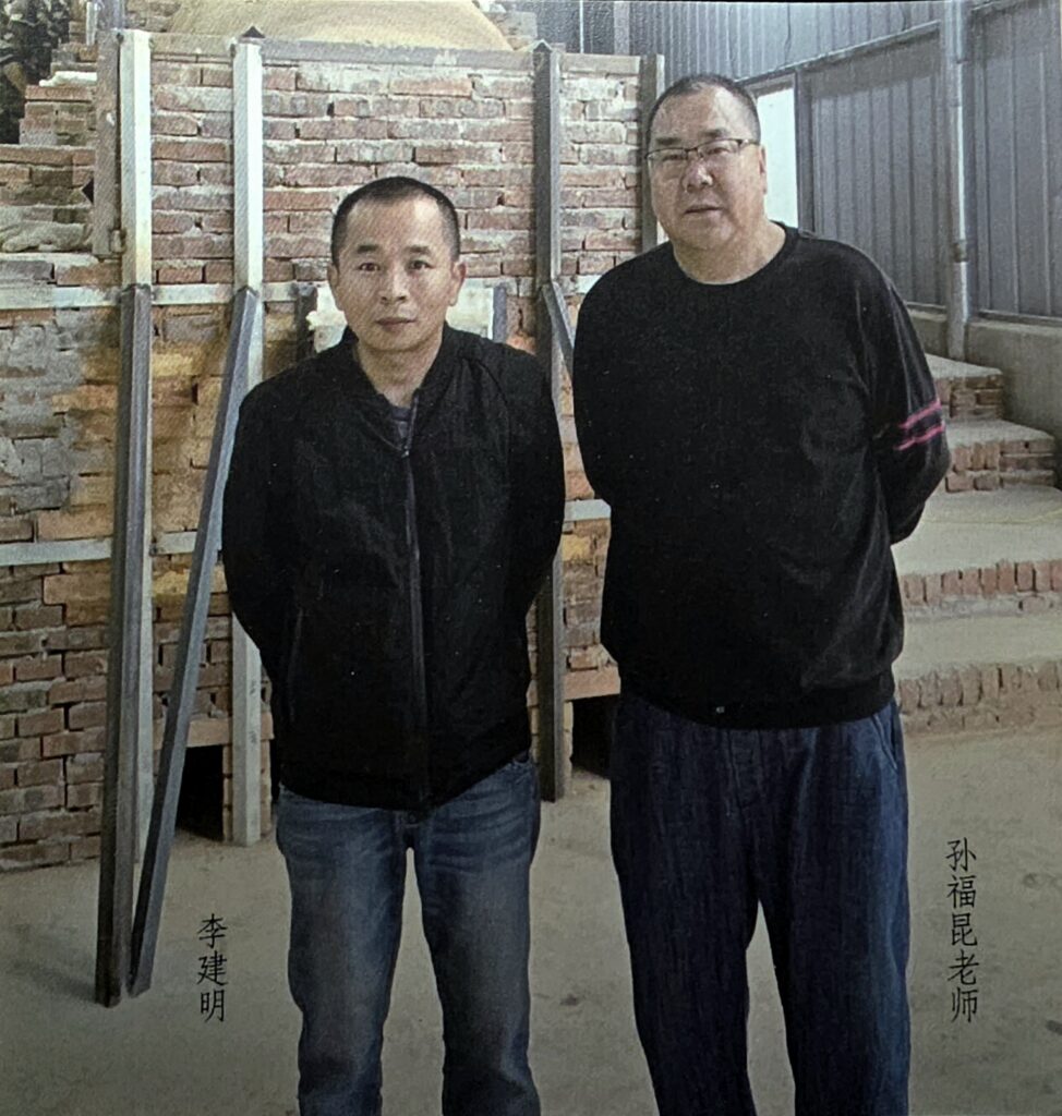 The booklet states that he studied under the well-known Jianzhan master Sun Fukun (孙福昆), showing a direct connection to an established lineage within the Jian ware world. A photo in the booklet identifies Li Jianming standing beside Master Sun Fukun, reinforcing this teacher-student relationship.