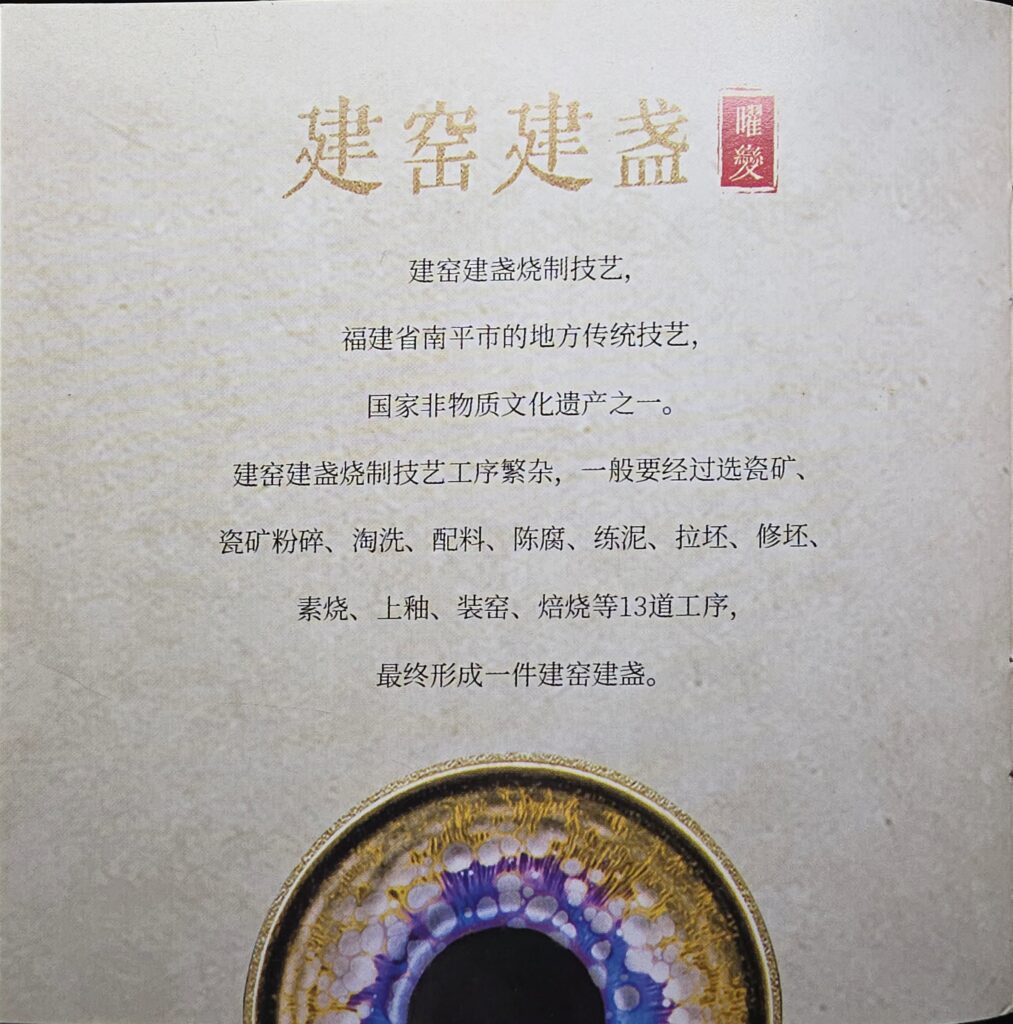 The booklet also includes a short introduction to Jian kiln and Jianzhan firing techniques, describing them as a traditional local craft of Nanping, Fujian, and as part of China’s national intangible cultural heritage. It explains that the making of a Jianzhan piece involves a complex multi-step process, including selecting ceramic ore, crushing, washing, mixing materials, aging the clay, kneading, wheel throwing, trimming, bisque firing, glazing, kiln loading, and final firing.