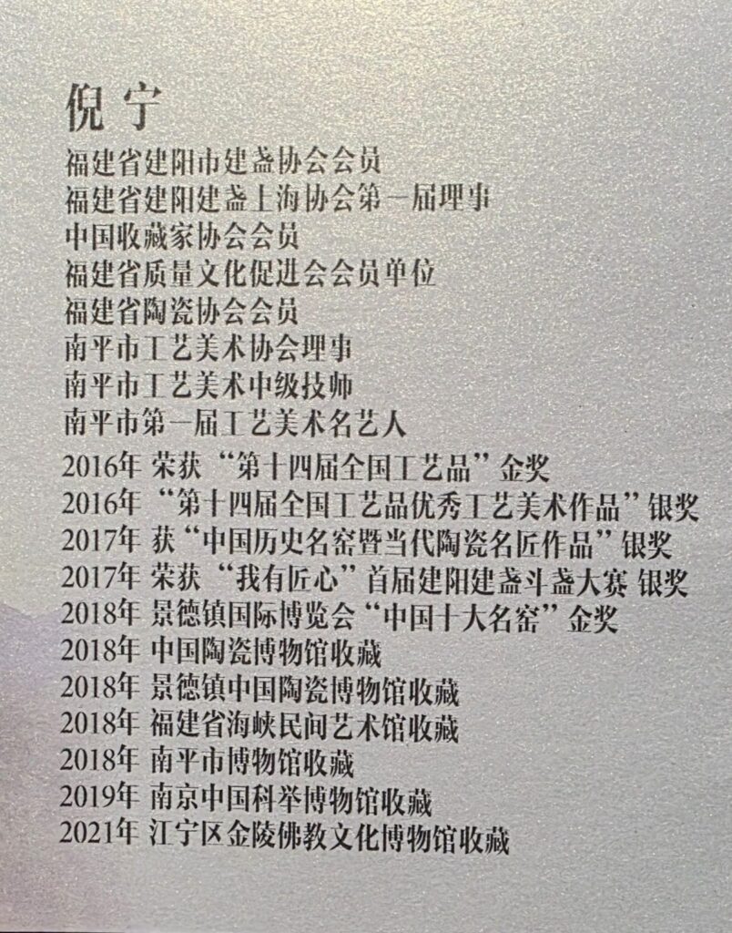 Ni Ning is a member of multiple prominent organizations, including the Jianyang Jian Zhan Association, the China Collectors Association, the Fujian Provincial Ceramic Association, and the Nanping Arts and Crafts Association, where he also serves as a council member. He is recognized as a mid-level arts and crafts technician and has been named a Distinguished Artist of the First Nanping Arts & Crafts Exhibition.
