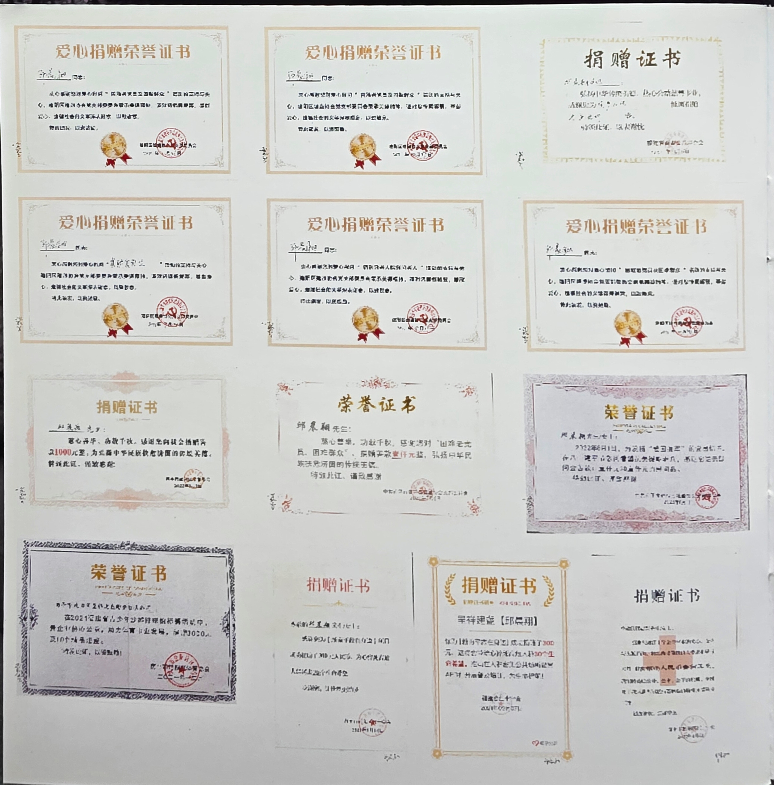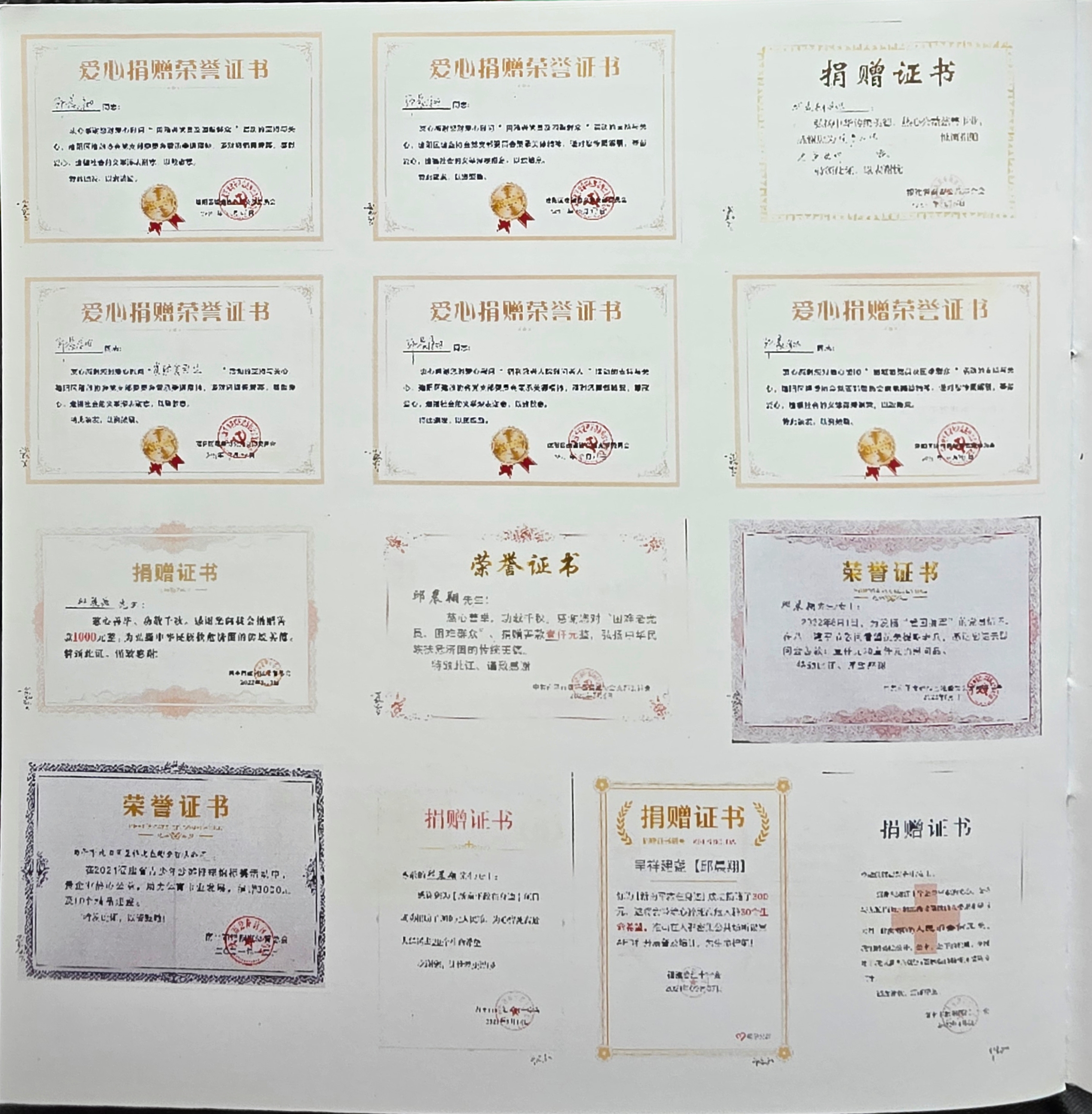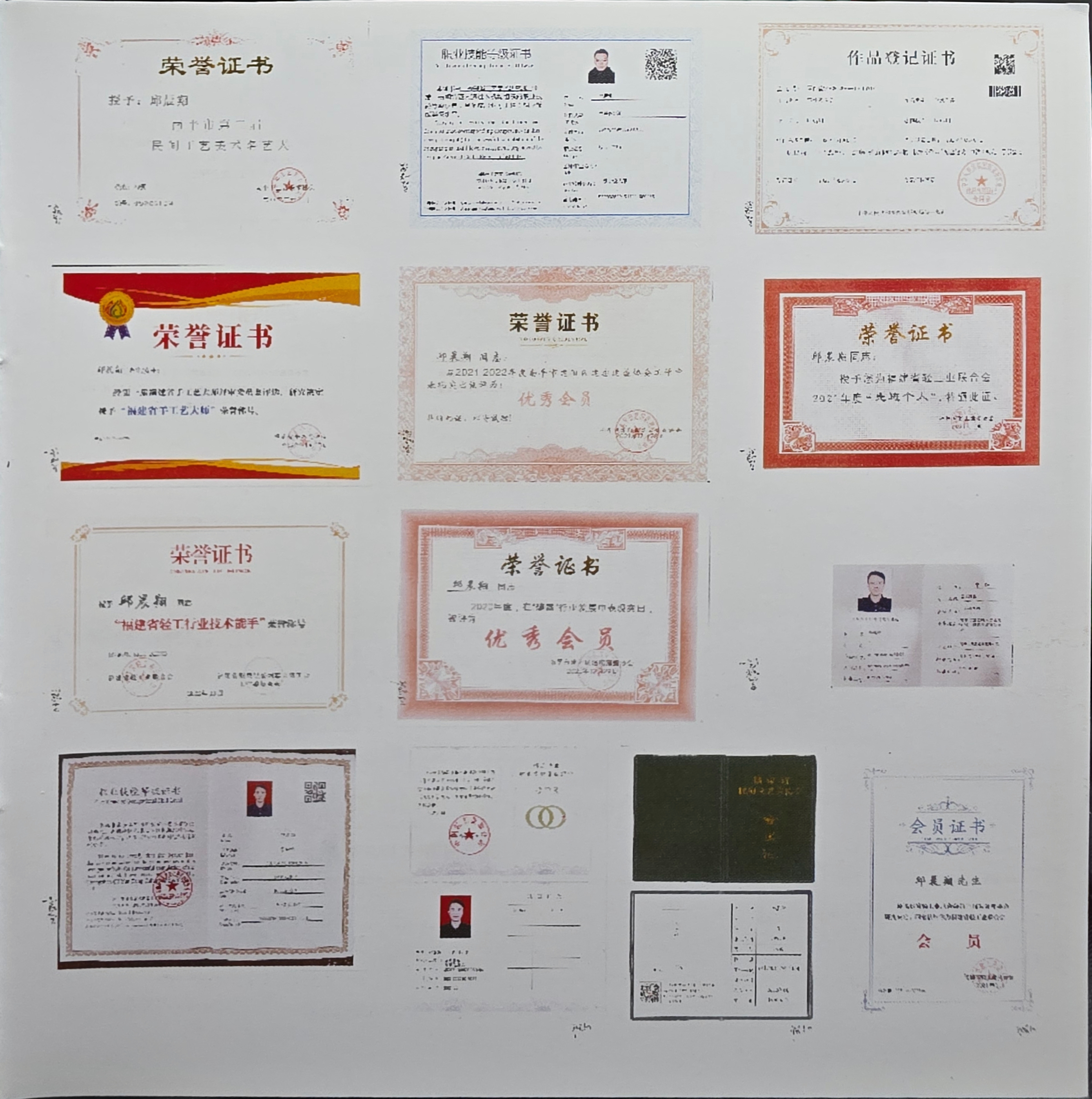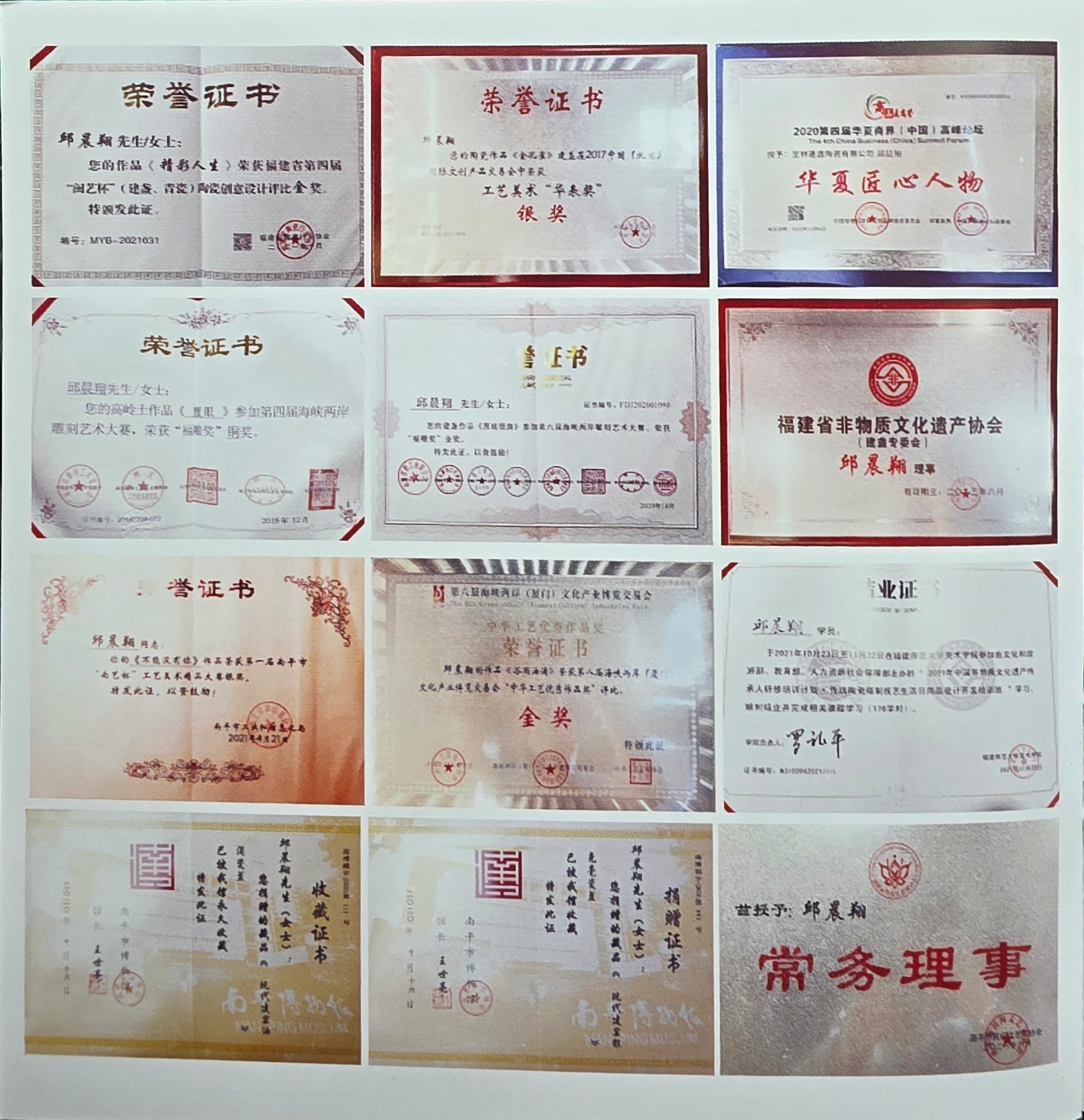 Over the years, Qiu Chenyang has received multiple honors for excellence in craftsmanship, contributions to cultural preservation, and philanthropic endeavors. His certifications include National Arts and Crafts recognitions, membership in heritage associations, and commendations for his artistic contributions to the community.