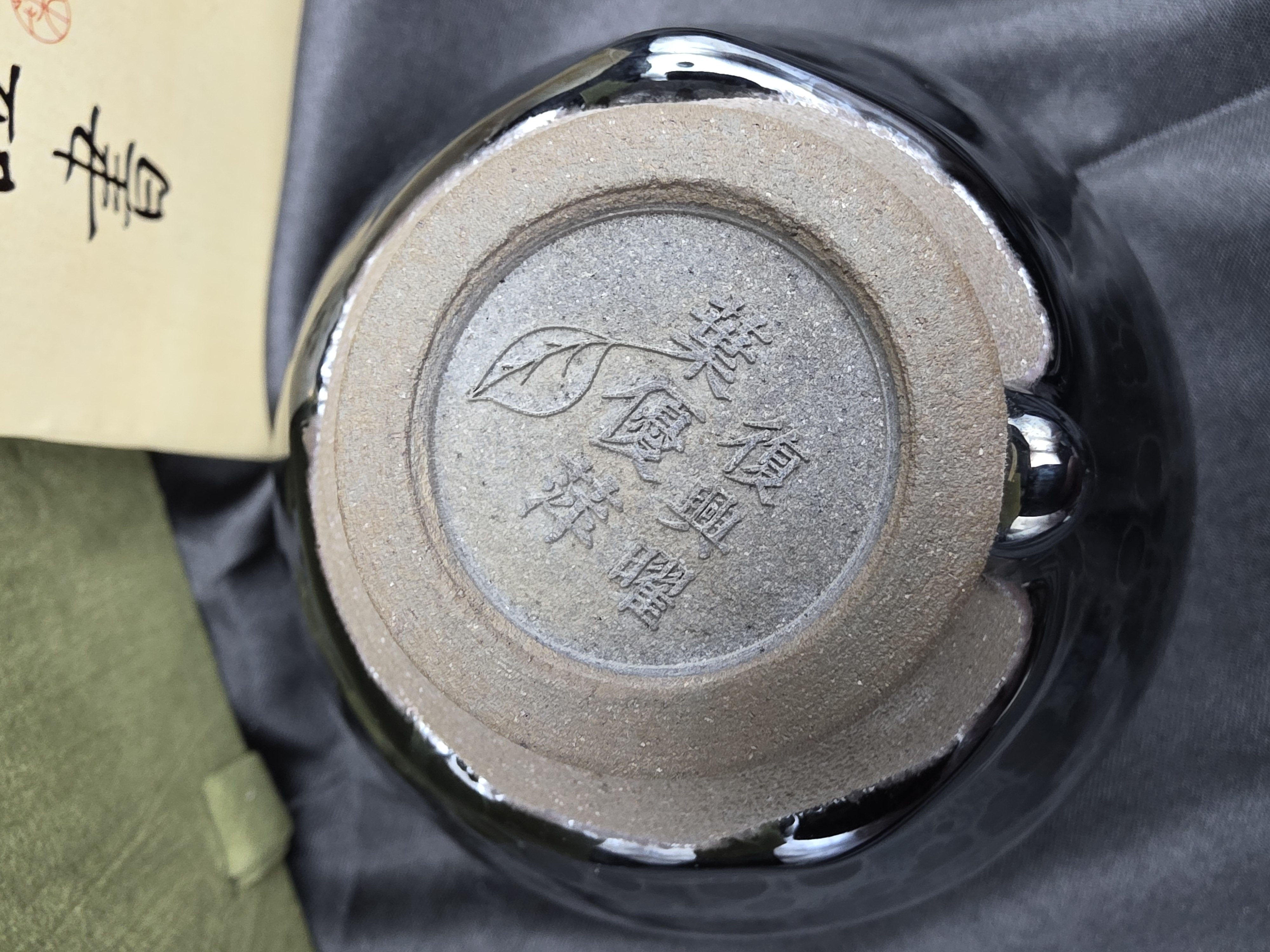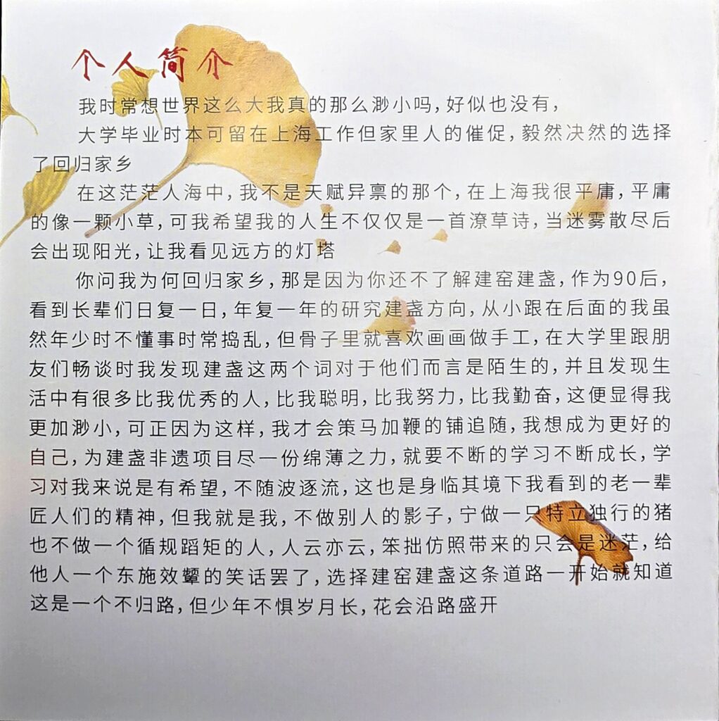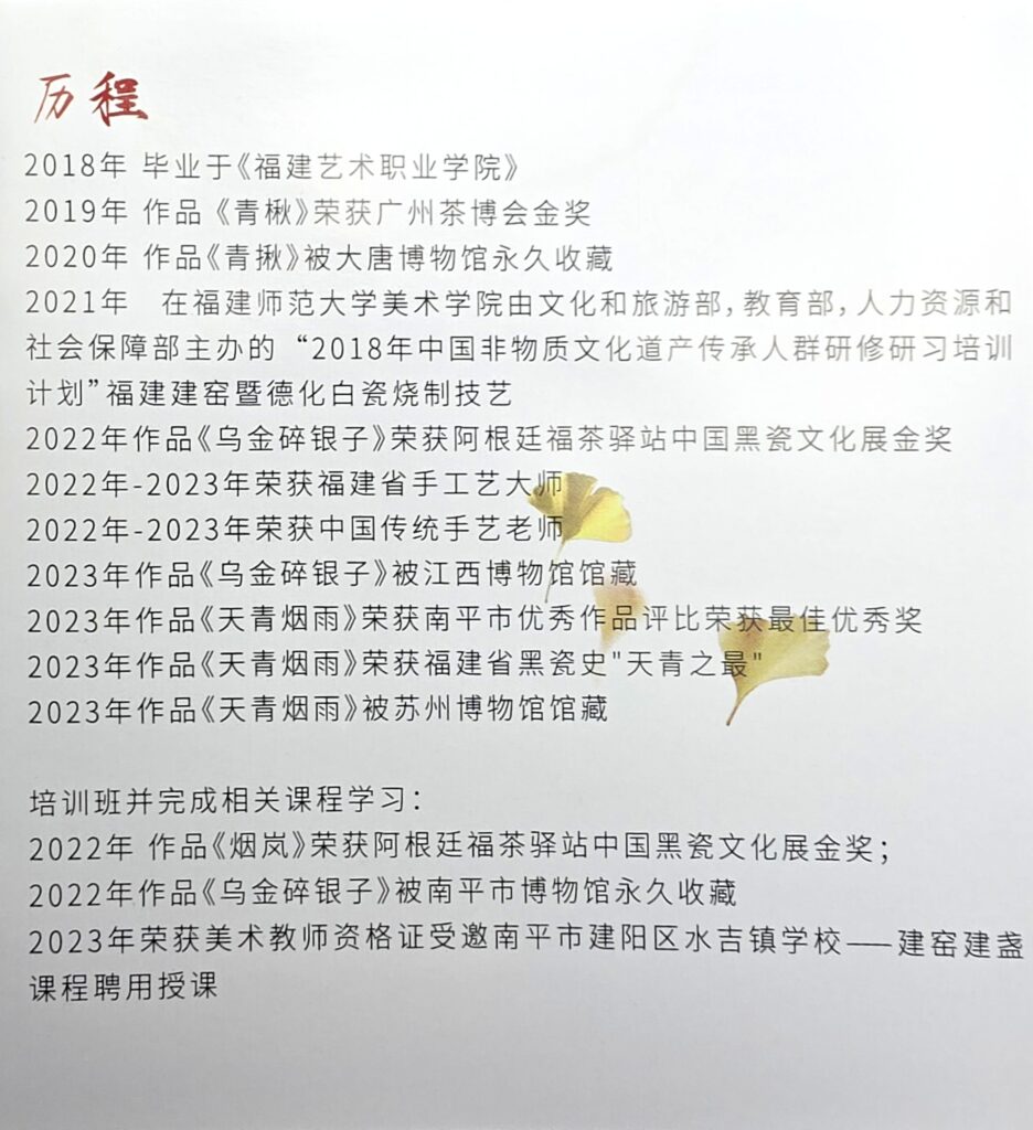 叶优萍(Ye Youping)creates Jian ware tea bowls with refined, poetic surfaces that echo classic whisked-tea aesthetics. Her booklet shows process photos, a personal seal, and base marks used on finished pieces.