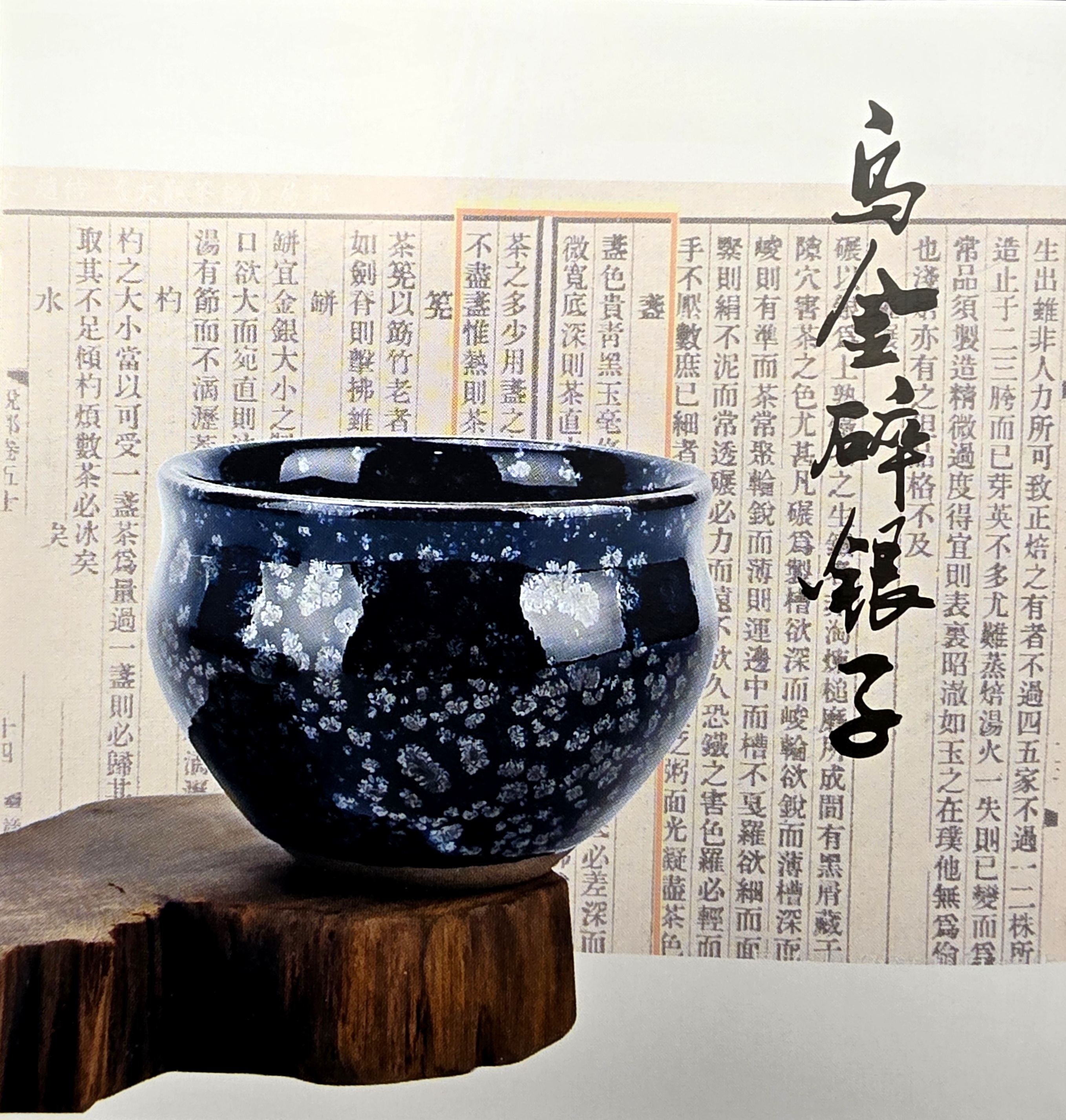 - 乌金晕银子 (Wūjīn yùn yínzi · “Black Gold with Silver Blossoms”) — dark ground with dense silvery crystalline flecks, oil-spot adjacent.
