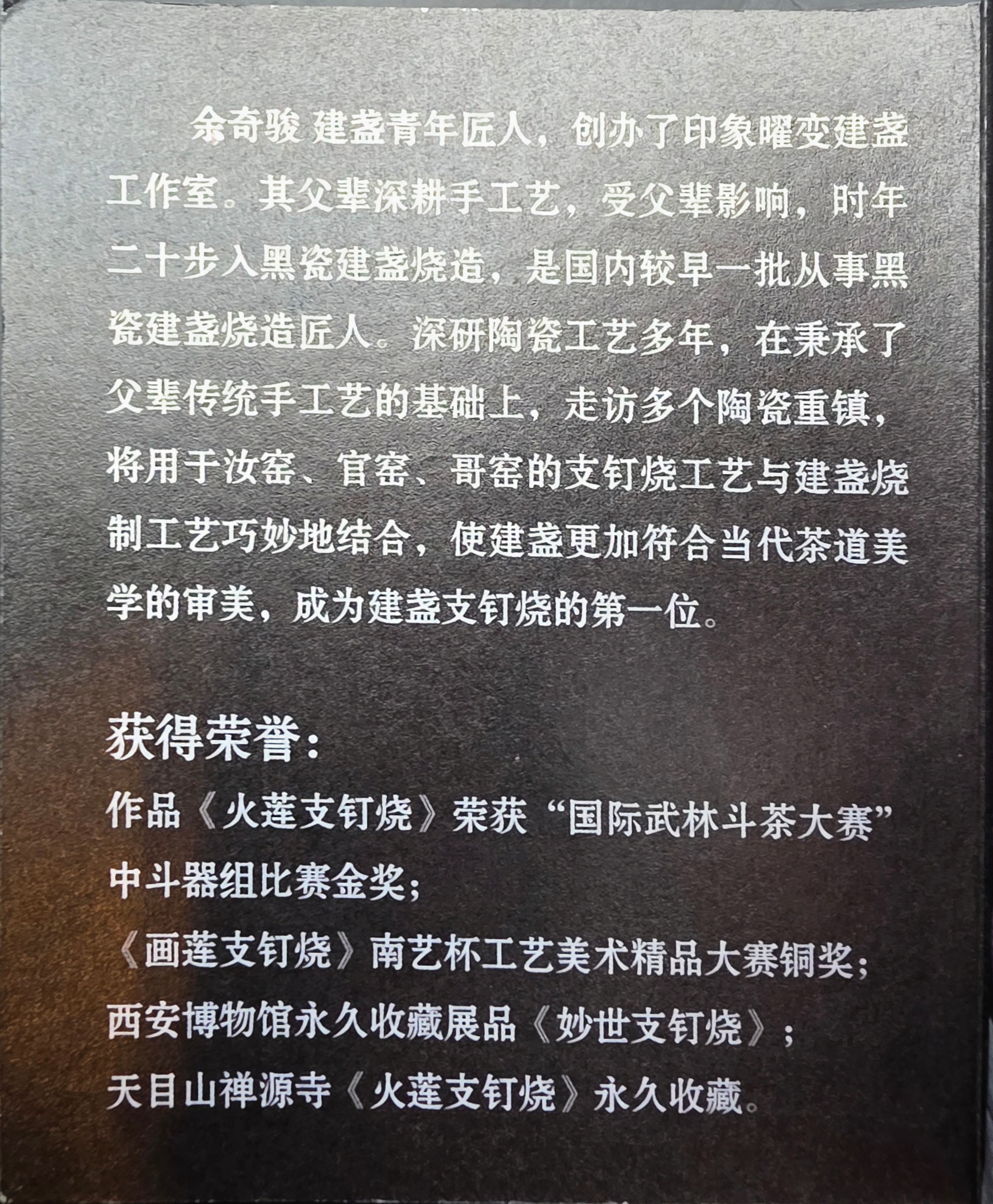 Yu Qijun is a rising star among young Jian ware artisans, founder of the “Impression Chameleon Jian Zhan Studio” (印象曜变建盏工作室). Influenced by his father, a dedicated craftsman, Yu began his journey into black-glazed Jian ware in his early twenties. He is part of one of the earlier domestic generations to specialize in modern-day Jian Zhan.