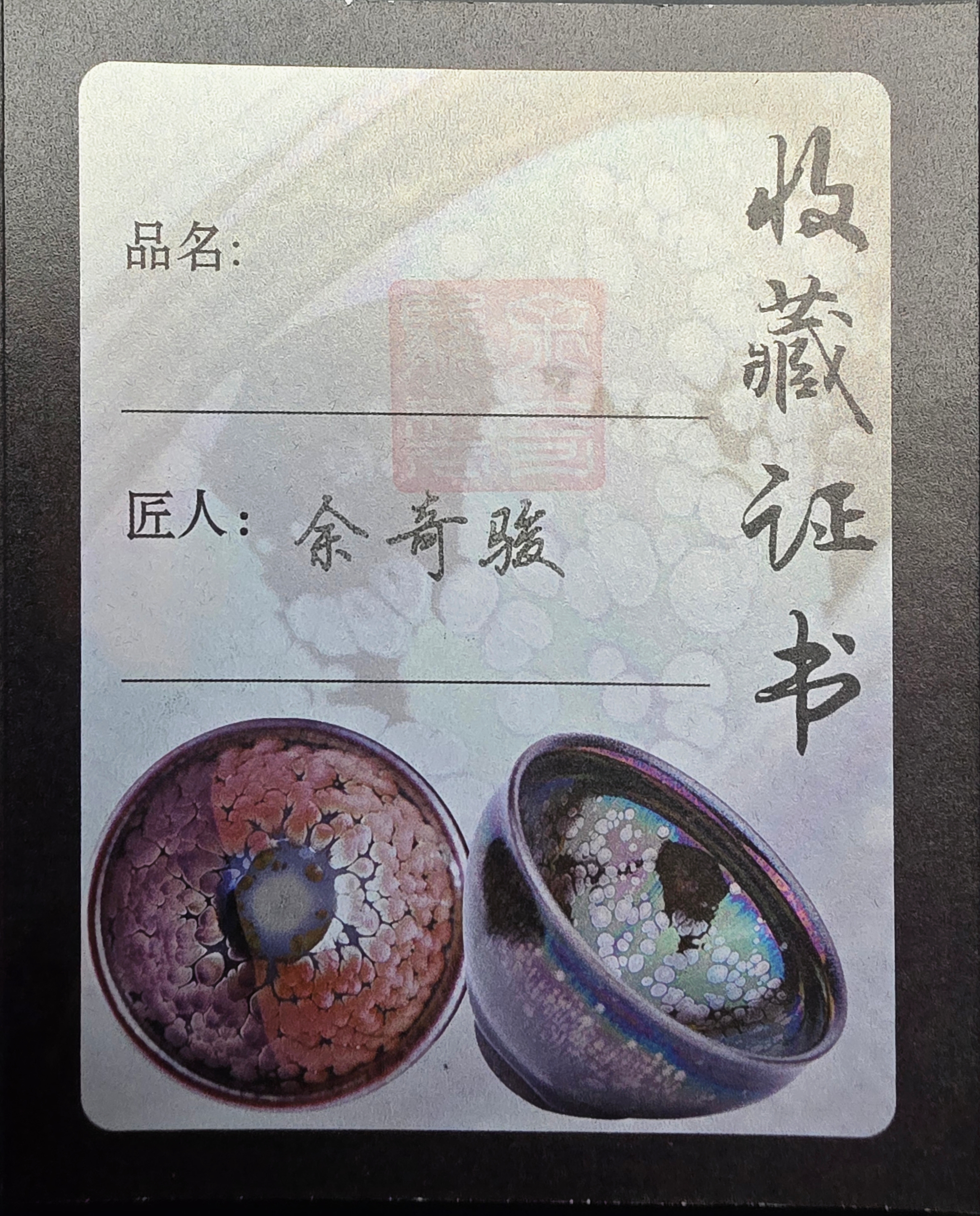 Each piece is accompanied by a Certificate of Authenticity signed by Yu Qijun (余奇骏), and often features stunning yaobian (曜变) effects—lustrous, iridescent patterns that reflect his mastery of the kiln’s fire and transformation.