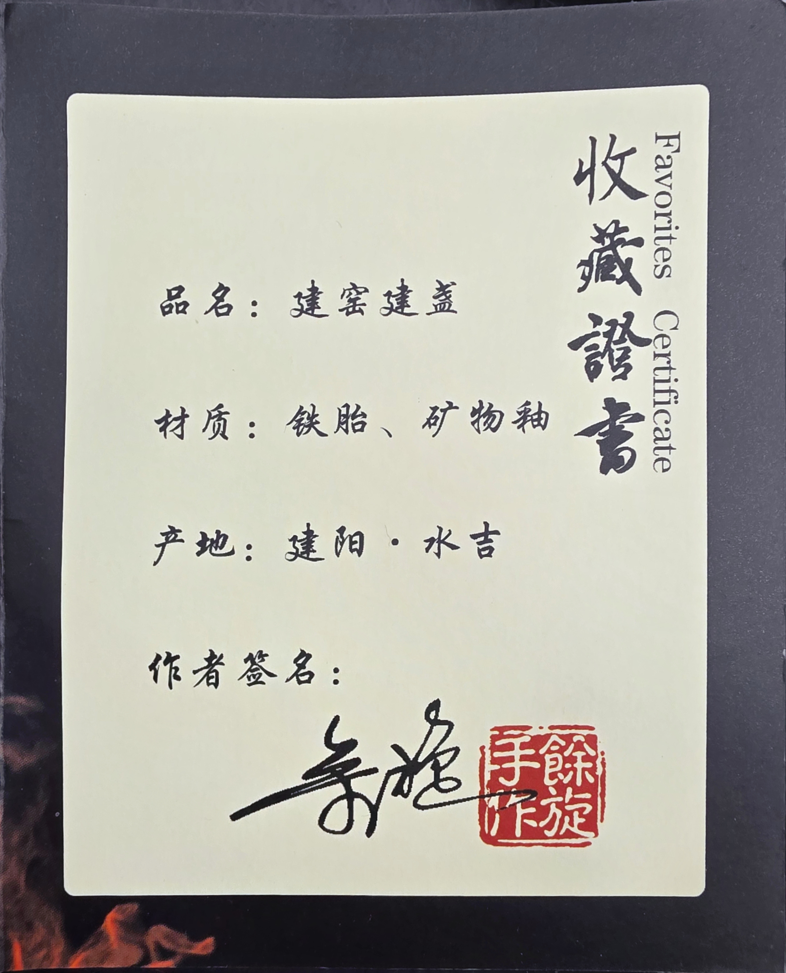 Recognized as a certified mid-level arts and crafts master, he is also an officially designated successor of Jianyang’s intangible cultural heritage. His studio’s creations are rooted in ancient Song Dynasty traditions, often fired using time-honored dragon kilns and signature glazes that evoke the cosmic depth and luster Jianzhan is famed for.