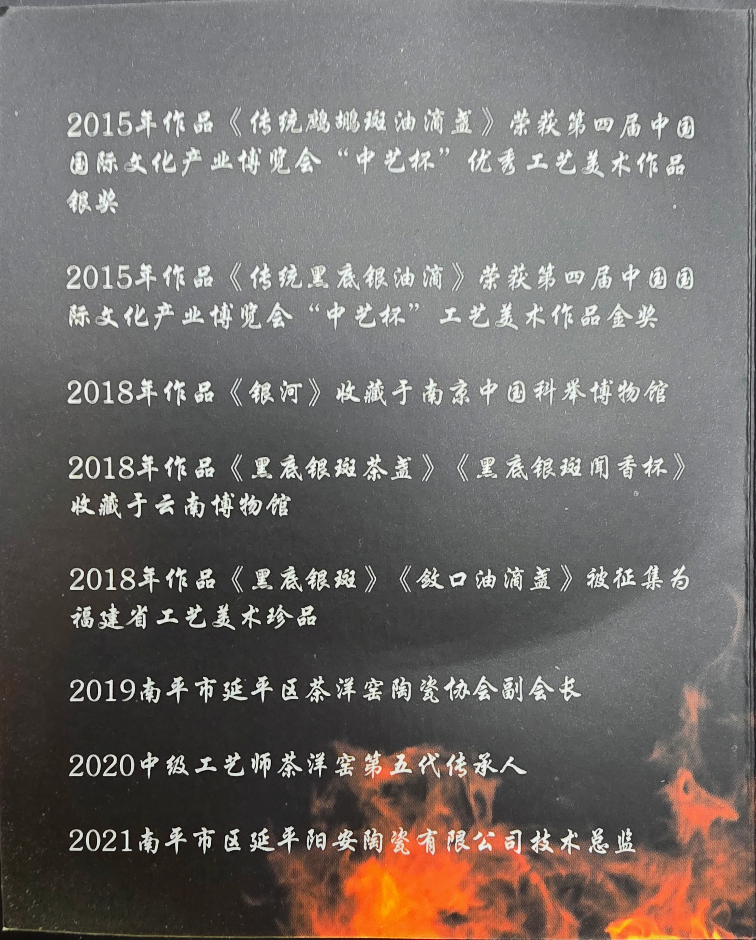 - 2020: Appointed Fifth-Generation Successor of Jianyang Tea Ware Craftsmanship