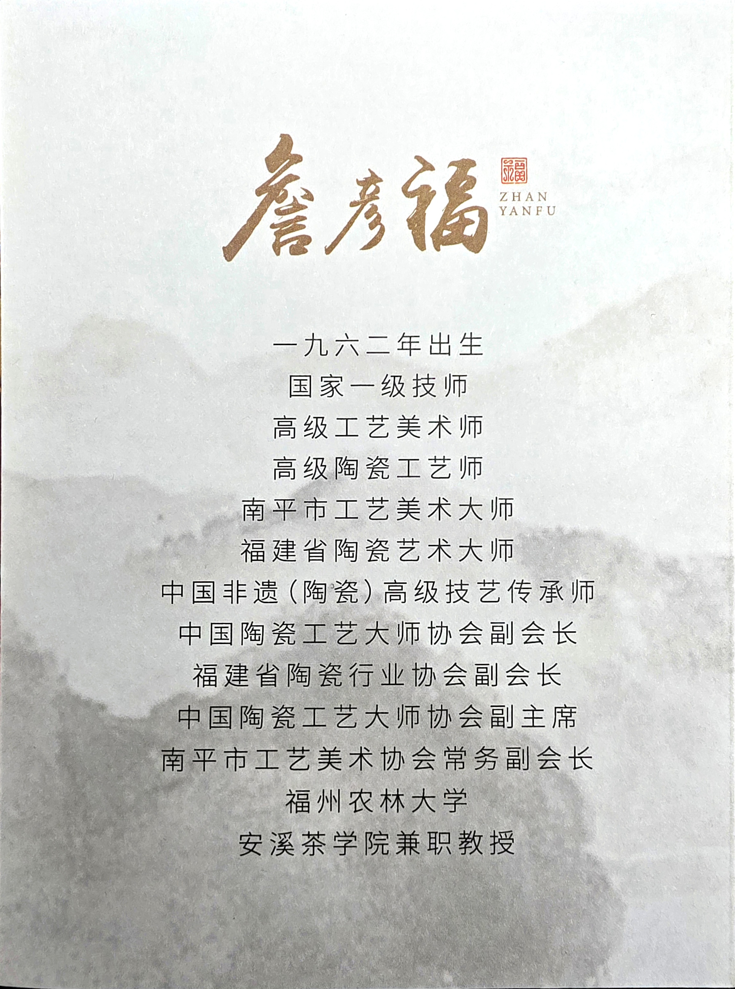 Zhan Yanfu is a Senior Inheritor of China’s Intangible Cultural Heritage (Ceramics) and serves as Vice President of the China Ceramic Art Master Association and the Fujian Provincial Ceramic Industry Association. He is also the Executive Vice President of the Nanping City Arts and Crafts Association.