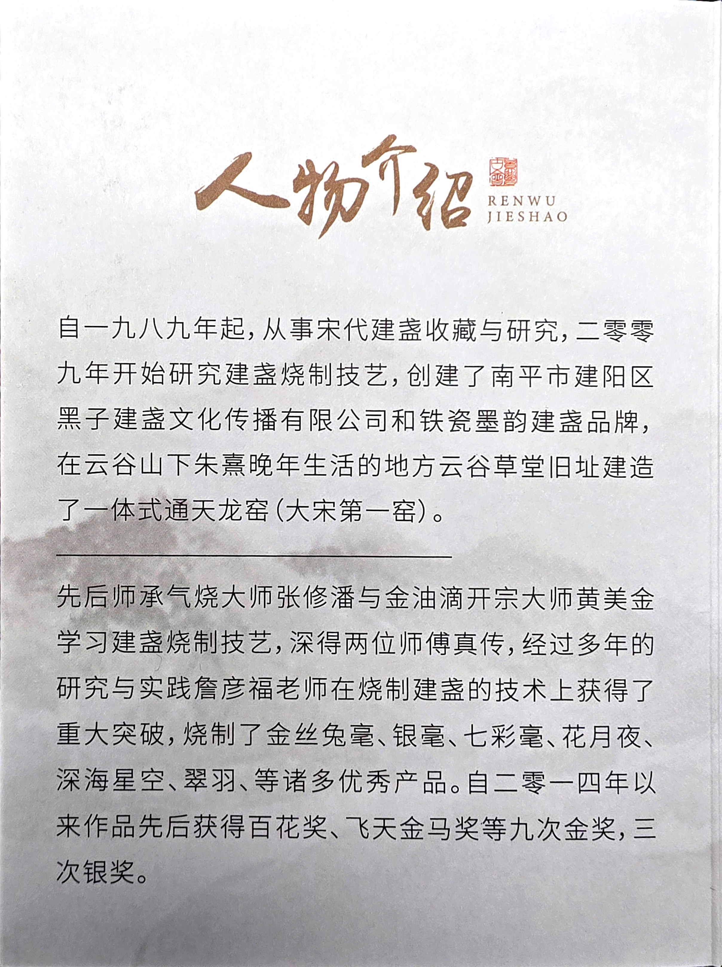 Since 1989, Zhan Yanfu has devoted himself to collecting and studying Jian Zhan. In 2009, he began pioneering work in the firing techniques of Jian Zhan ceramics, founding Heizi Jian Zhan Cultural Communication Co., Ltd. and the “Tieci Moyun” Jian Zhan brand in Jianyang District, Nanping City. He also constructed a traditional Tongtian dragon kiln, known as the “Number One Kiln of the Song Dynasty,” at the historical Yun Gu Cao Tang, once the late-life residence of Song Dynasty philosopher Zhu Xi.