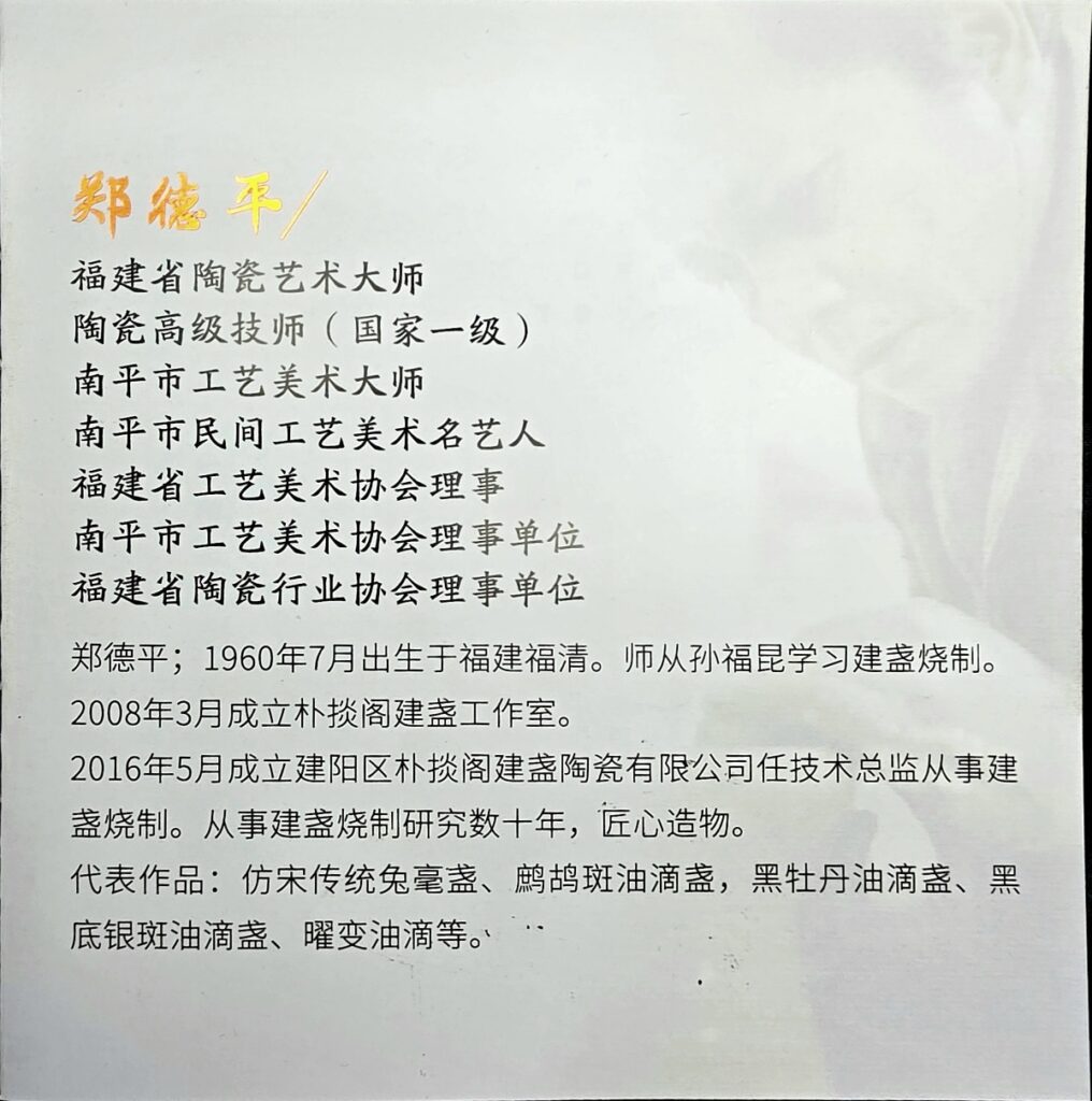 郑德平,1960年7月生于福建福清,师从孙福昆学习建盏烧制技艺。2008年创立斗盏陶建盏工作室,2016年在建阳区成立斗盏陶建盏陶瓷有限公司并担任总技术监。几十年来专注于建盏制作与研究,匠心独运,技艺精湛。