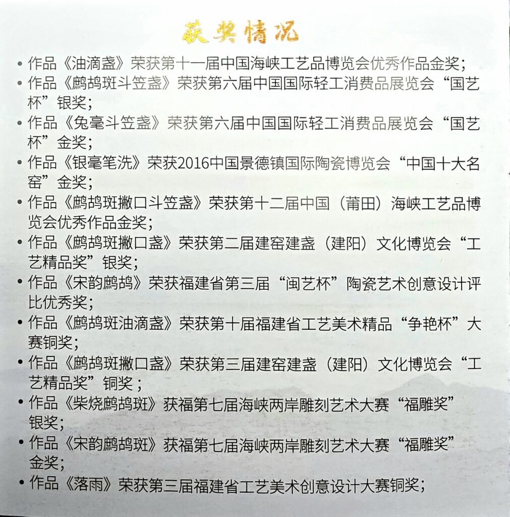 - 《宋韵鹧鸪斑》荣获福建省第三届“闽艺杯”陶瓷艺术创意设计评比优秀奖
