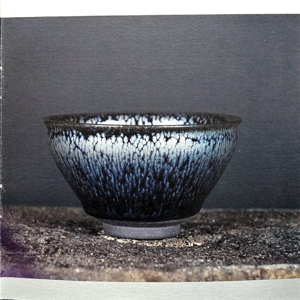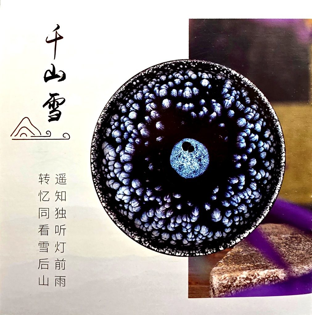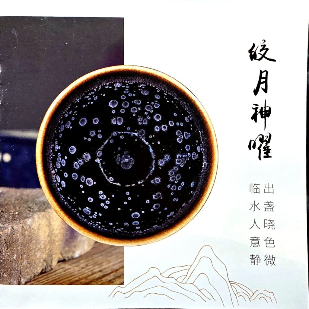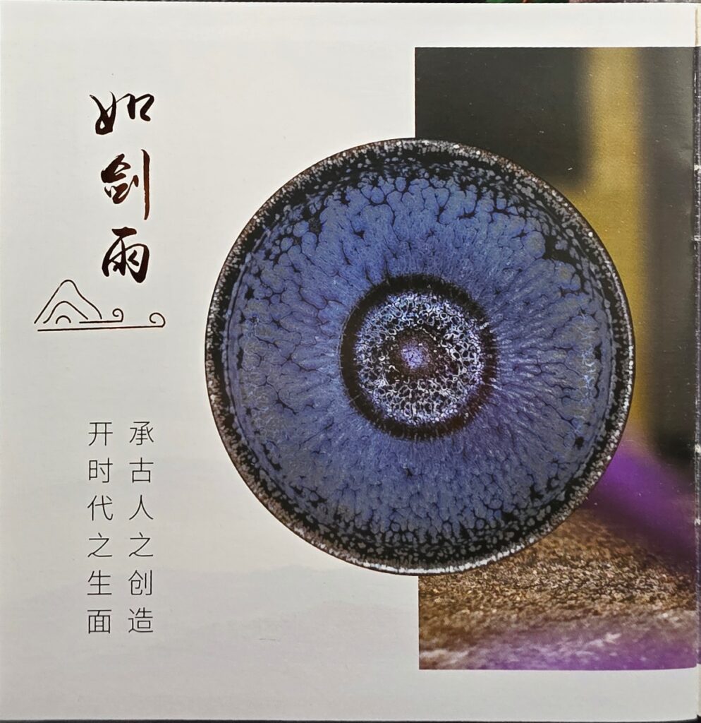 下图展示了郑德平老师的几款代表作,包括曜变油滴盏《皎月神曜》、蓝曜变盏《如剑雨》以及典型的鹧鸪斑油滴风格作品。每一只盏都体现了其对建盏美学的深刻理解与数十年技艺的沉淀。